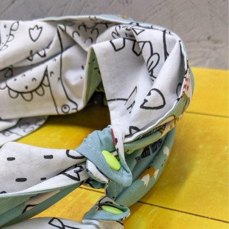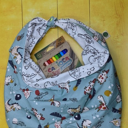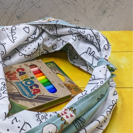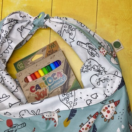 Ce tapis ludique et créatif propose quatre usages différents : un tapis de jeu géant de 1m x 1m, un coloriage géant représentant le planisphère et des animaux de chaque continent, un sac baluchon pratique grâce aux boutons-pression colorés, et un emballage cadeau inspiré des furoshikis pour un effet Wahou !