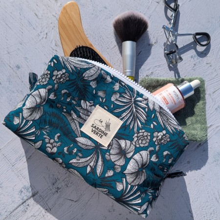 La trousse Feuillage vert mesure 21 cm de long, 11,5 cm de haut et 6 cm de large. Son format généreux permet d’y glisser :