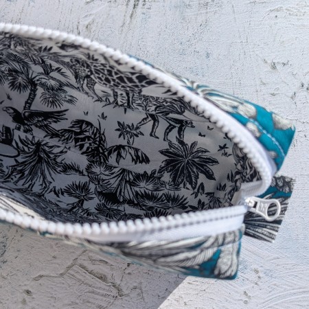 L’extérieur est orné d’un joli imprimé feuillage blanc sur fond vert profond, qui évoque une jungle douce et stylée. L’intérieur te réserve une surprise : un tissu jungle noir et blanc avec girafes, singes et palmiers pour une touche graphique.