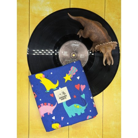 L'extérieur représente des dinosaures aux couleurs douces faisant du patin à roulette, écoutant de la musique, le tout sur un fond violet vif qui donne la pêche !